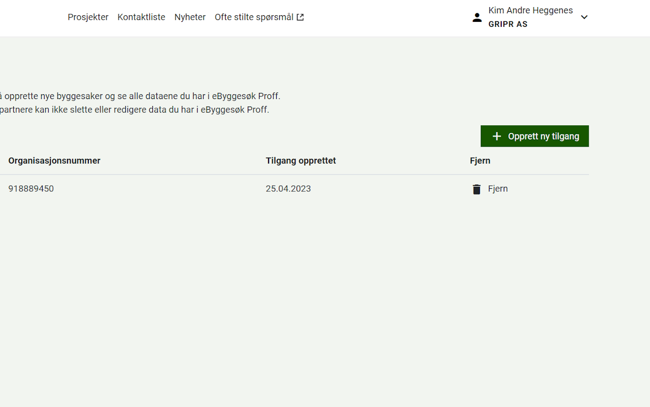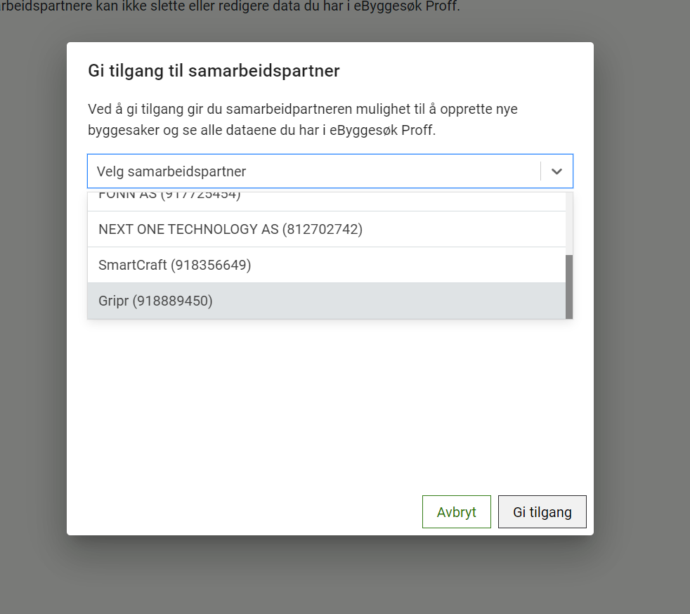 In order for Gripr and eByggesøk to work together, you must add Gripr as a collaborative partner to eByggesøk.