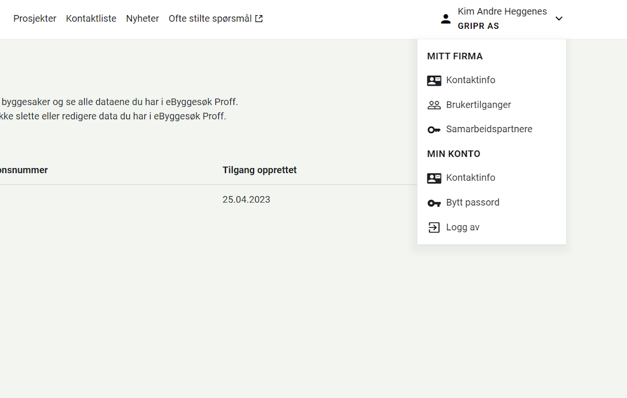 Log in to eByggesøk and click on your profile at the top right and select partners.
