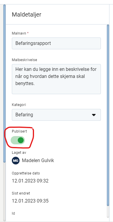 Maldetaljer vil da Äpnes og du mÄ trykke pÄ publiser knappen sÄ den blir grÞnn